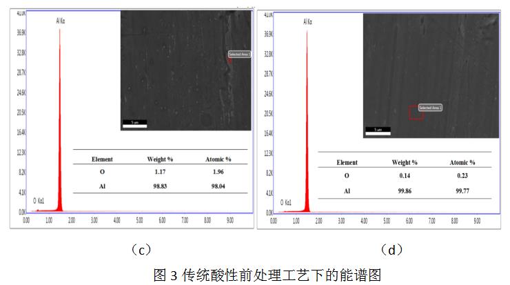 為驗證其表面狀態的變化,通過能譜對鋁合金表面元素進行測試,圖3(a)為鋁合金未處理基體面掃能譜圖,可以看到基體表面主要由鋁元素和氧元素組成,氧的質量百分比在0.73%左右。圖(b)為酸性脫脂后鋁合金表面面掃能譜圖,可知脫脂后鋁合金表面氧元素質量百分比下降至0.41%,說明酸性脫脂對鋁氧化膜較優異的刻蝕能力。圖(c)為酸性脫脂后鋁合金表面白色點條狀物的點掃能譜圖,可以看出脫脂后鋁合金表面出現的白色點條狀物含有非常高的氧元素,質量占比達到了1.17%,這也正印證了脫脂后表面白色點條狀物為鋁的氧化膜這一想法。圖(d)為無鉻鈍化后鋁合金表面面掃能譜圖,氧元素質量百分比為0.14%,可以看到鋁合金表面氧元素含量在此過程中還有消耗,并且在能譜中并未發現組成鈍化膜的其他元素,可能是鈍化膜中元素含量較低且并未達到儀器檢測精度。