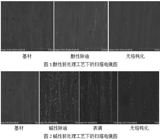 圖1為傳統酸性前處理工藝下每道工序后的5000X掃描電鏡圖,其中可以看出未經前處理的基材表面非常光潔細膩,這是由于鋁合金基材在自然環境下發生氧化,從而形成一層非常致密的氧化膜。分別觀察兩種不同工藝對前處理表面狀態的影響,可以看出通過傳統酸性前處理工藝除油后鋁合金表面狀態依然非常平整,僅有少量白色點條狀物在基材表面凸起,這里可能是在酸性脫脂刻蝕過程后殘留下來的鋁的氧化膜,之后經過鈍化處理的鋁合金表面相較于脫脂后更加平整光潔,基本未見凸起氧化膜,可能在其表面還存在一層致密的鈍化膜層。